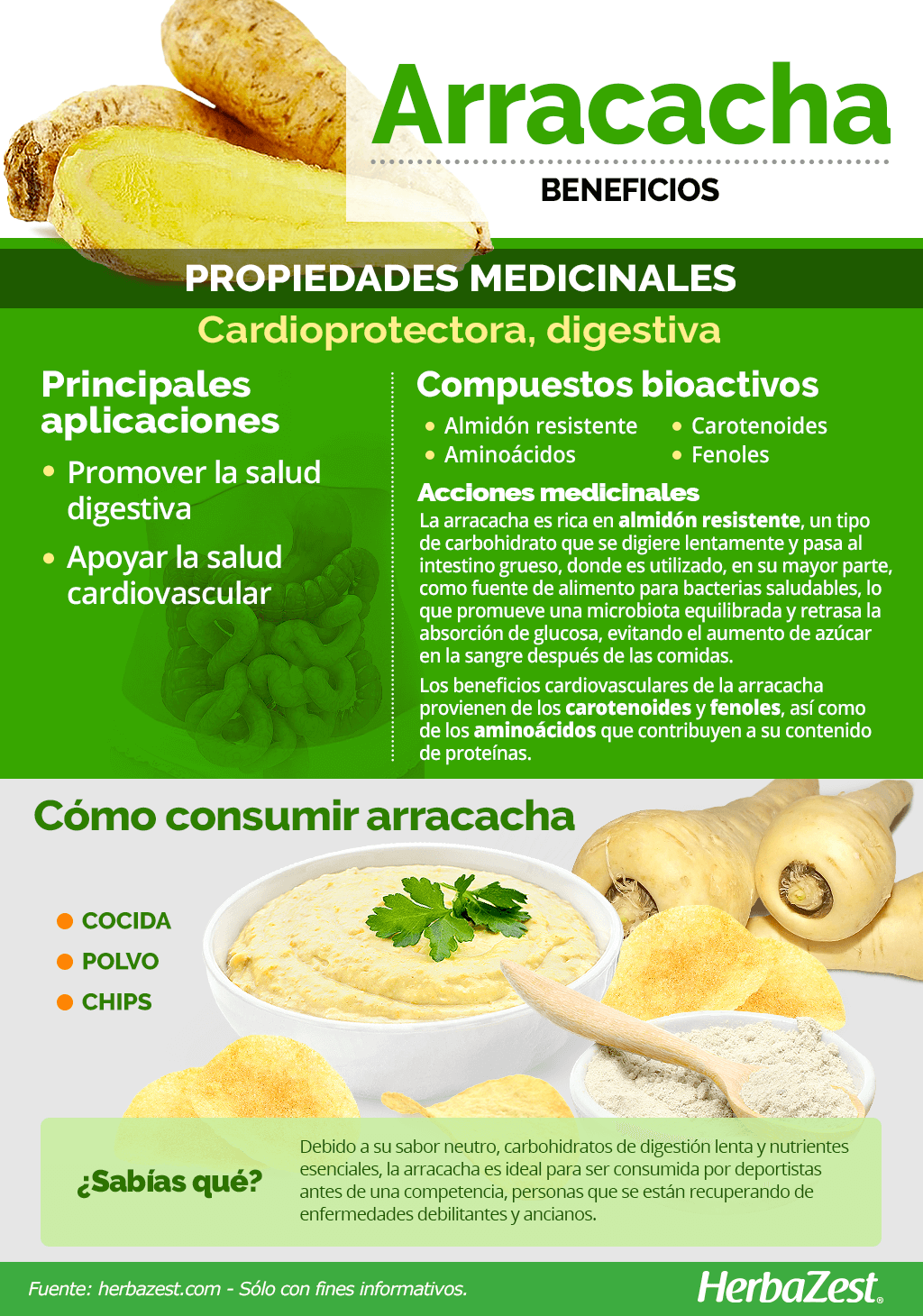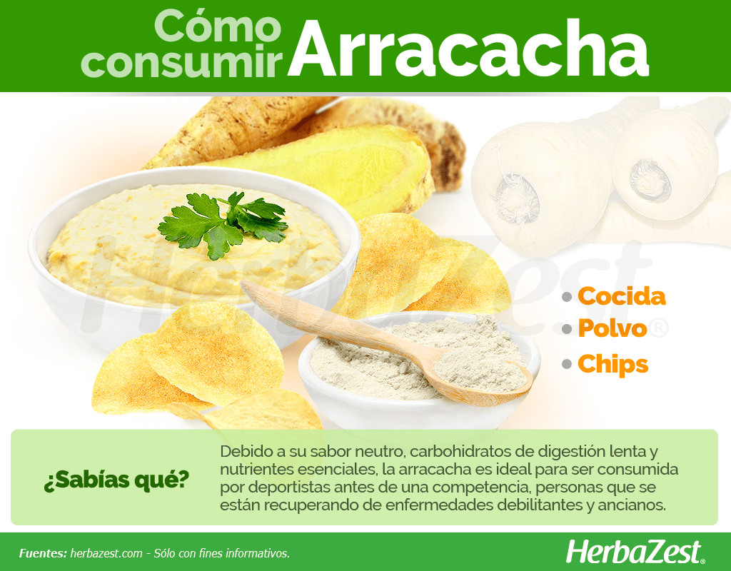 DEBIDO A SU SABOR NEUTRO, CARBOHIDRATOS DE LIBERACIÓN LENTA Y NUTRIENTES ESENCIALES, LA ARRACACHA ES UN ALIMENTO IDEAL PARA ATLETAS ANTES DE UNA COMPETENCIA, PARA LA RECUPERACION DE ENFERMEDADES DEBILITANTES Y PARA COMPLEMENTAR LA DIETA DE ADULTOS MAYORES.