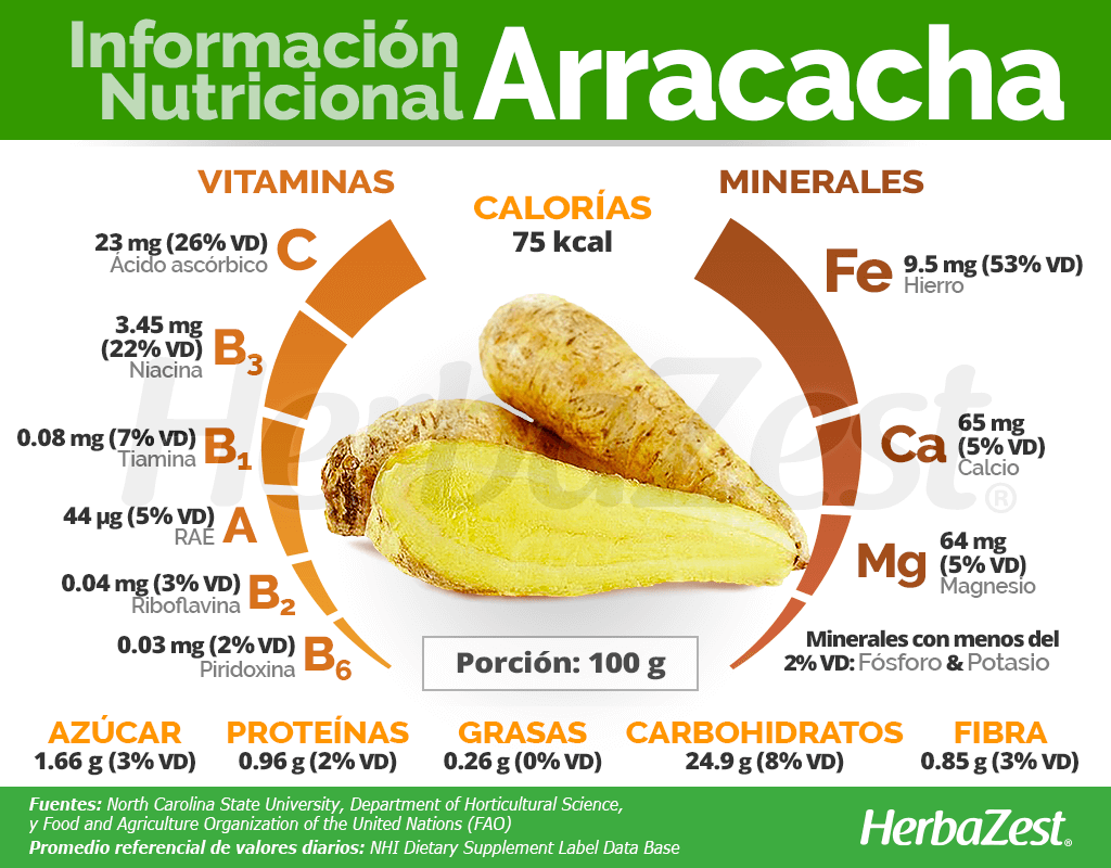 100 GRAMOS DE RAÍZ DE ARRACACHA PROPORCIONAN 75 CALORÍAS, QUE SE ATRIBUYEN PRINCIPALMENTE A SU CONTENIDO DE CARBOHIDRATOS (8% VD), FIBRA (3% VD), AZÚCARES (3% VD) Y PROTEÍNAS (2% VD).
