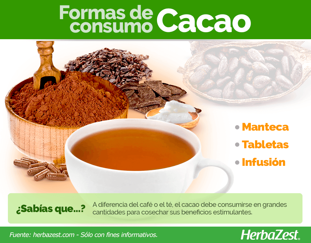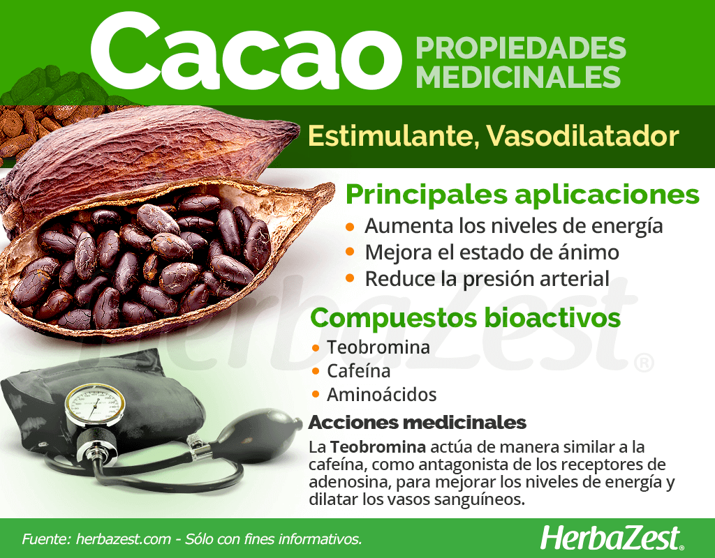 Aumentar los niveles de energía. El efecto estimulante del cacao se debe a su acción vasodilatadora, que aumenta el flujo sanguíneo.