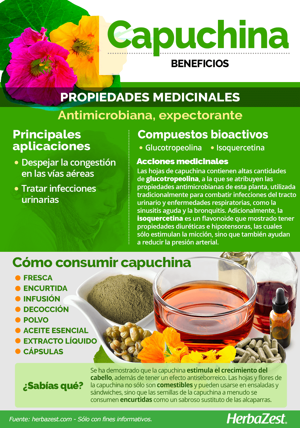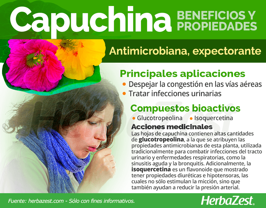 Tratar infecciones urinarias. La capuchina se consume para estimular la micción y combatir infecciones bacterianas.