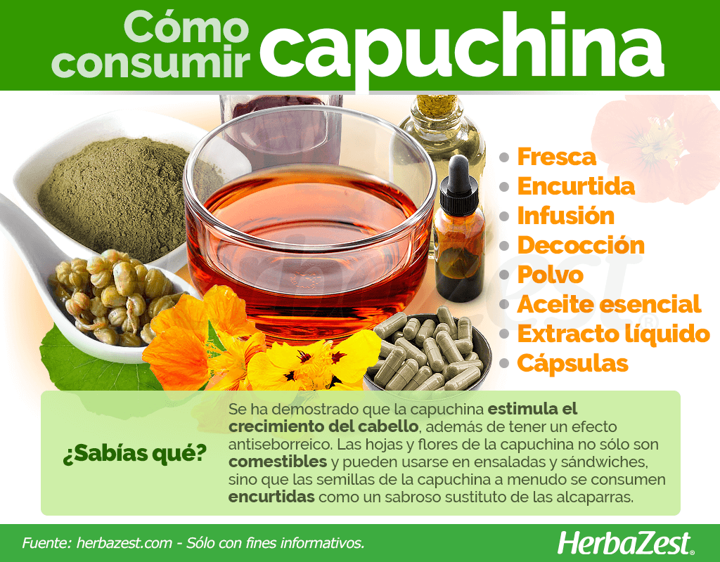 Las hojas, flores y semillas de capuchina tienen aplicaciones tanto medicinales como culinarias. Algunos herbolarios recomiendan que, para aprovechar los beneficios de la capuchina, lo mejor es utilizar las partes frescas de la hierba; sin embargo, la capuchina, o mastuerzo, se puede encontrar en una variedad de formas complementarias y también es posible preparar remedios caseros con ella.