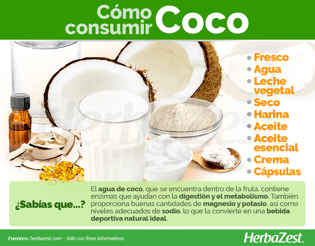 El agua de coco, que se encuentra al interior del fruto, contiene compuestos como citoquinina, fosfatasa y catalasa, enzimas que ayudan con la digestión y el metabolismo.