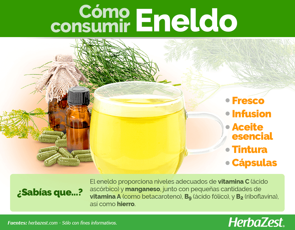 Infusión. Fresca o seca, toda la planta de eneldo se puede preparar como un té de hierbas tibio y tomarse para aliviar la flatulencia y las molestias digestivas.