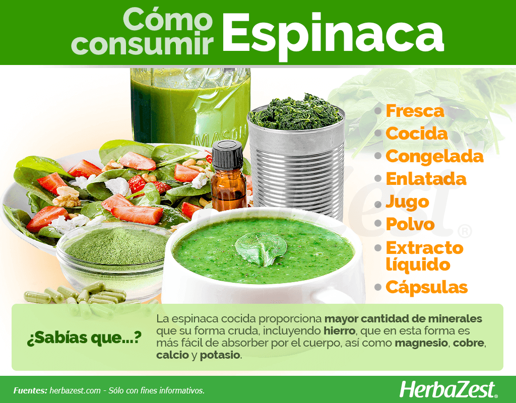 Comer espinaca cruda o cocida proporciona grandes beneficios para la salud; sin embargo, la concentración de nutrientes solubles en agua, como la vitamina C (ácido ascórbico) y la vitamina B9 (folato) se reduce cuando las hojas se exponen al calor. Por otro lado, la espinaca cocida proporciona mayores cantidades de minerales, principalmente hierro (que en esta forma es más fácil de absorber por el cuerpo), así como magnesio, cobre, calcio y potasio.