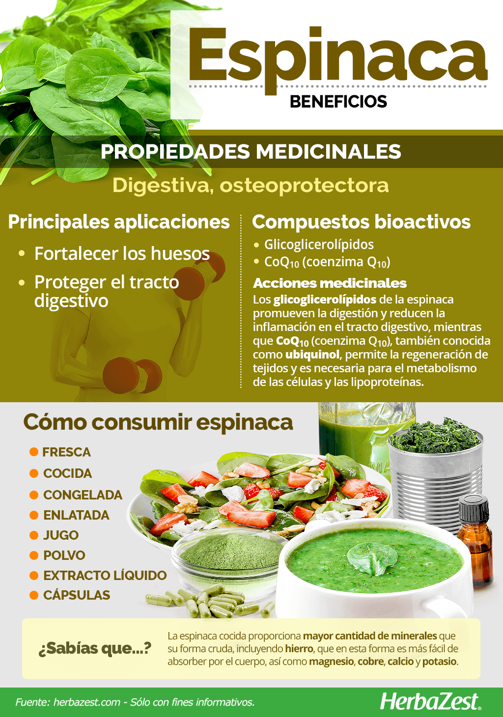 Si bien la espinaca es muy apreciada por su contenido nutricional, también se ha encontrado que posee importantes cualidades curativas. Se ha demostrado que las propiedades de la espinaca pueden ser utilizadas con fines medicinales, principalmente para: