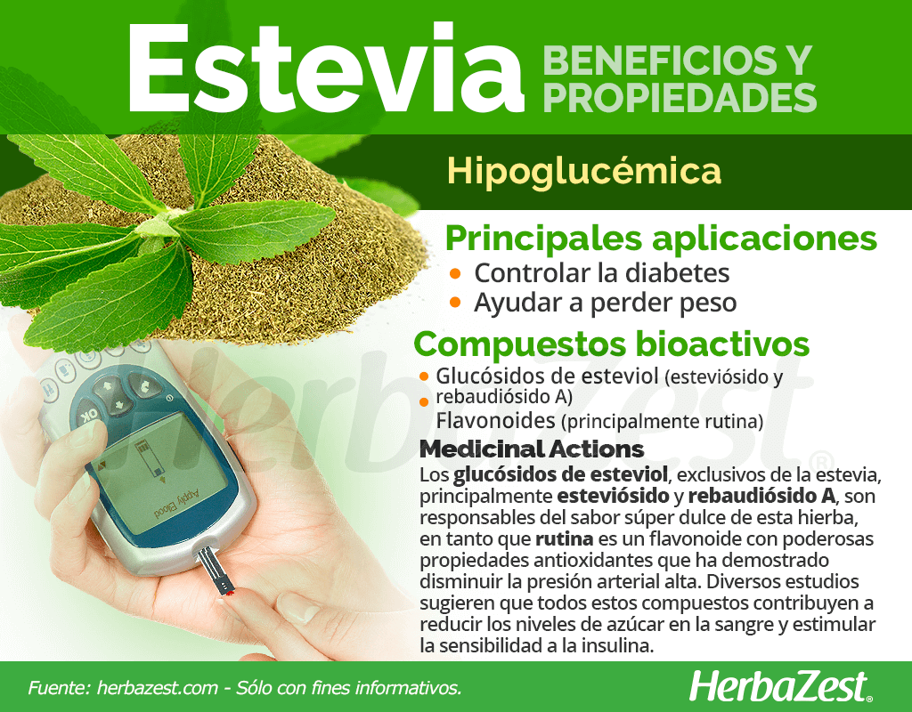 Controlar la diabetes. Las investigaciones han demostrado que la estevia no afecta los niveles de azúcar en sangre ni la respuesta a la insulina de la misma manera que el azúcar. Por lo tanto, la estevia es una opción más saludable para los diabéticos que el azúcar o los edulcorantes artificiales.1