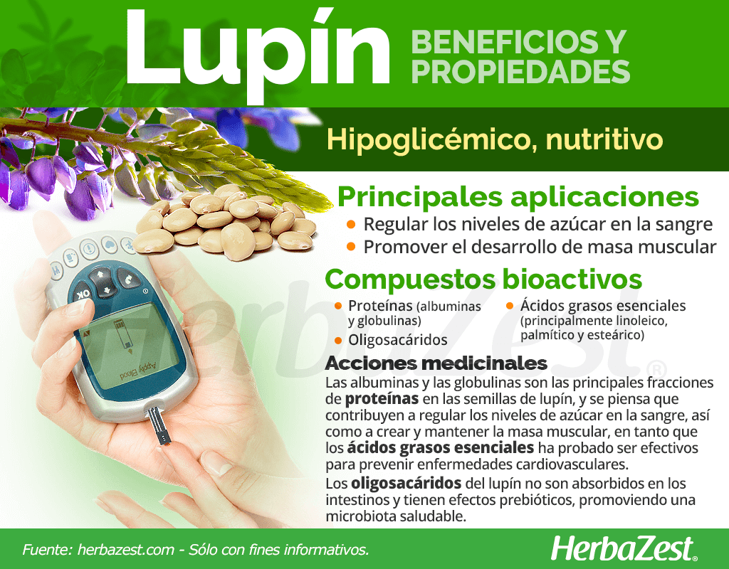 Regular los niveles de azúcar en sangre. Una variedad de estudios científicos han relacionado el consumo de lupín con niveles reducidos de glucosa en la sangre de individuos diabéticos y prediabéticos.