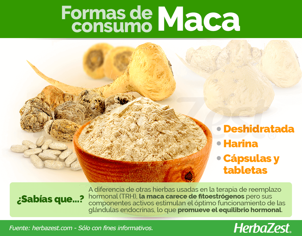 Cápsulas. Esta es la forma más popular de consumir maca. Las cápsulas contienen una alta concentración de esteroles y FAA, y se pueden tomar en dosis diarias fijas y fáciles de ingerir, a fin de mantener el equilibrio hormonal.