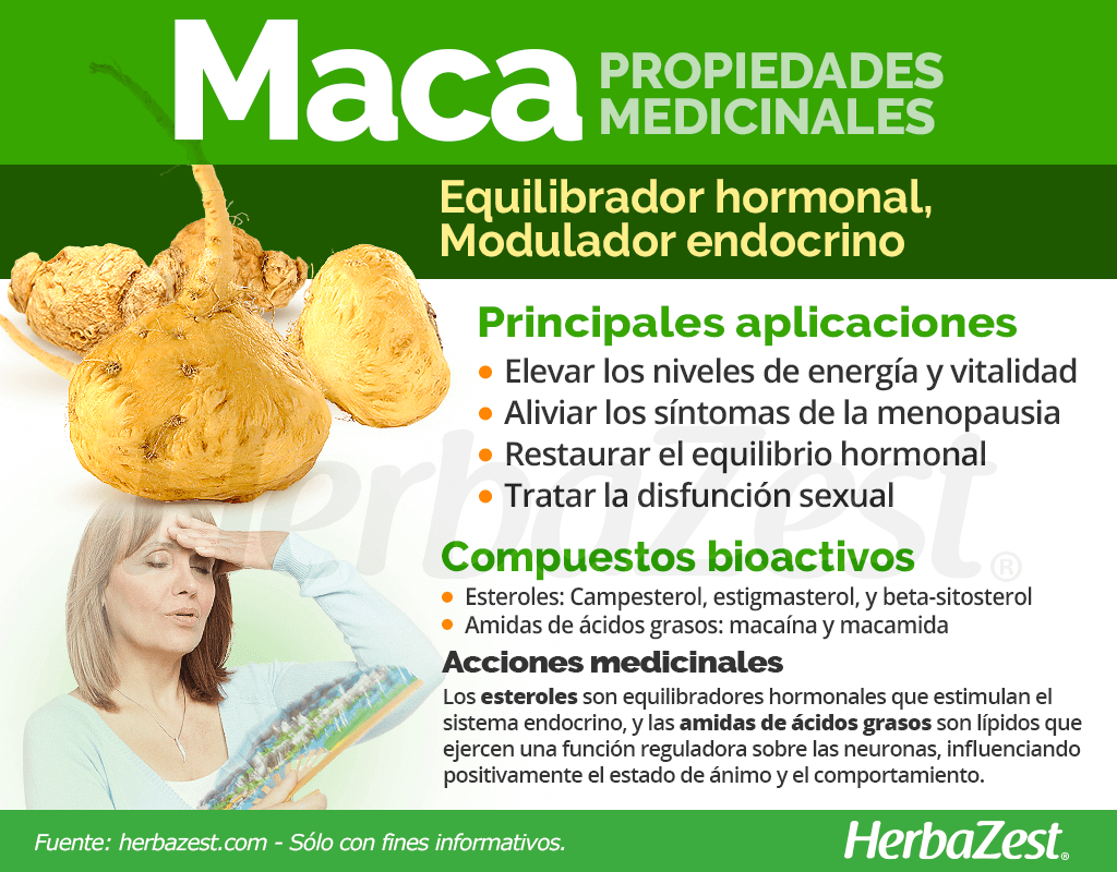Tanto los esteroles como las AAG contribuyen a las siguientes propiedades de la maca: equilibrio de las secreciones hormonales, estimulación del metabolismo corporal (energía y vitalidad), reducción del estrés y la depresión, y mejoras en la memoria y el impulso sexual. La maca ha demostrado ser beneficiosa principalmente en el tratamiento de trastornos hormonales, particularmente en mujeres durante la menopausia6 y en hombres con disfunción sexual.7