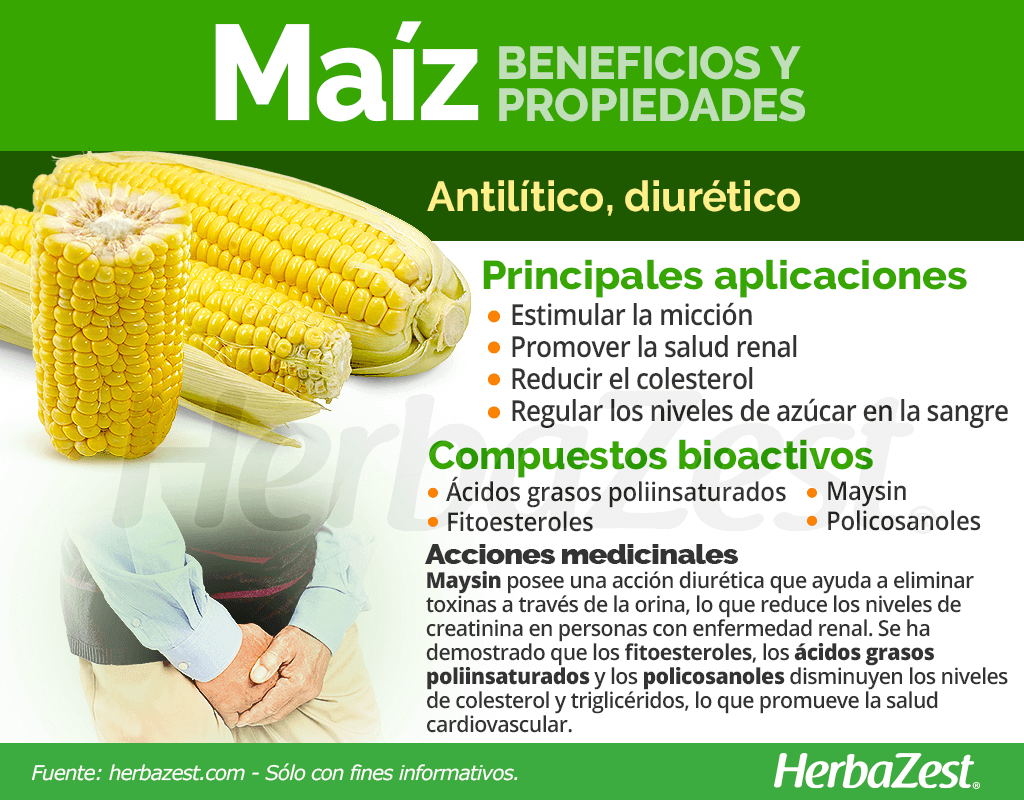 Estimular la micción. El maíz se ha usado como diurético durante milenios debido a su capacidad para incrementar la eliminación de toxinas y el exceso de potasio a través de la orina.
