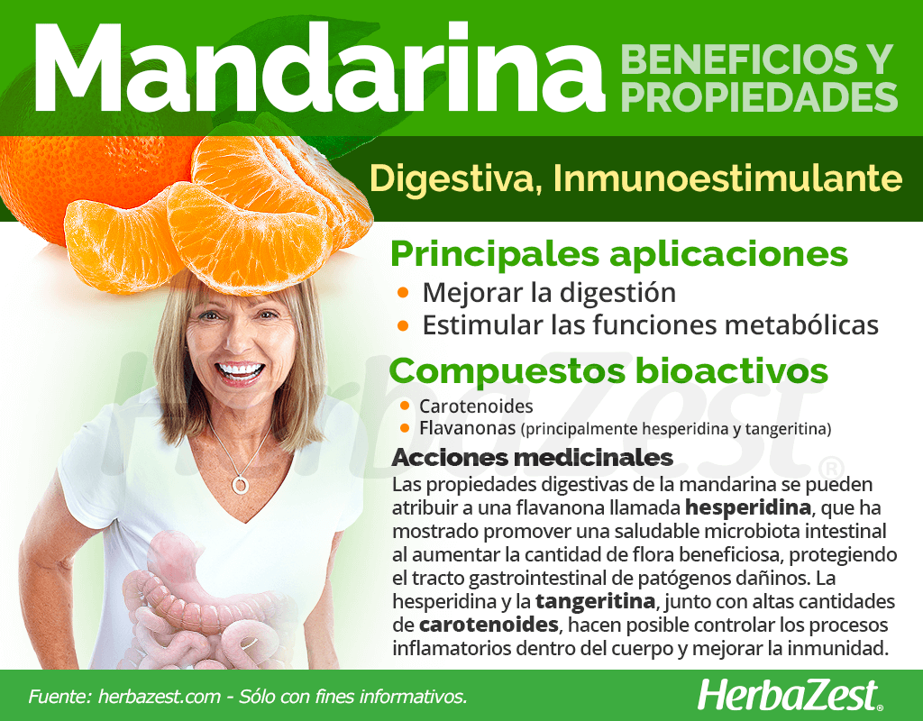 Los beneficios de la mandarina son numerosos y similares a los de la naranja. Tanto la cáscara como el carnoso interior de la mandarina se han usado tradicionalmente para aliviar una amplia variedad de condiciones de salud; sin embargo, hoy en día las propiedades de la mandarina se emplean principalmente para: