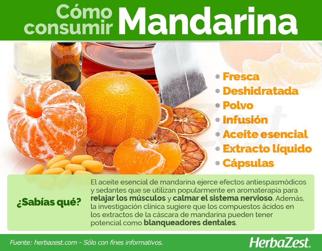 Todas las partes de la mandarina han sido empleadas como fuente tradicional de nutrición y medicina, sin embargo, su valor nutricional se obtiene principalmente de formas naturales, mientras que los beneficios de la mandarina para la salud se pueden obtener de preparaciones medicinales.