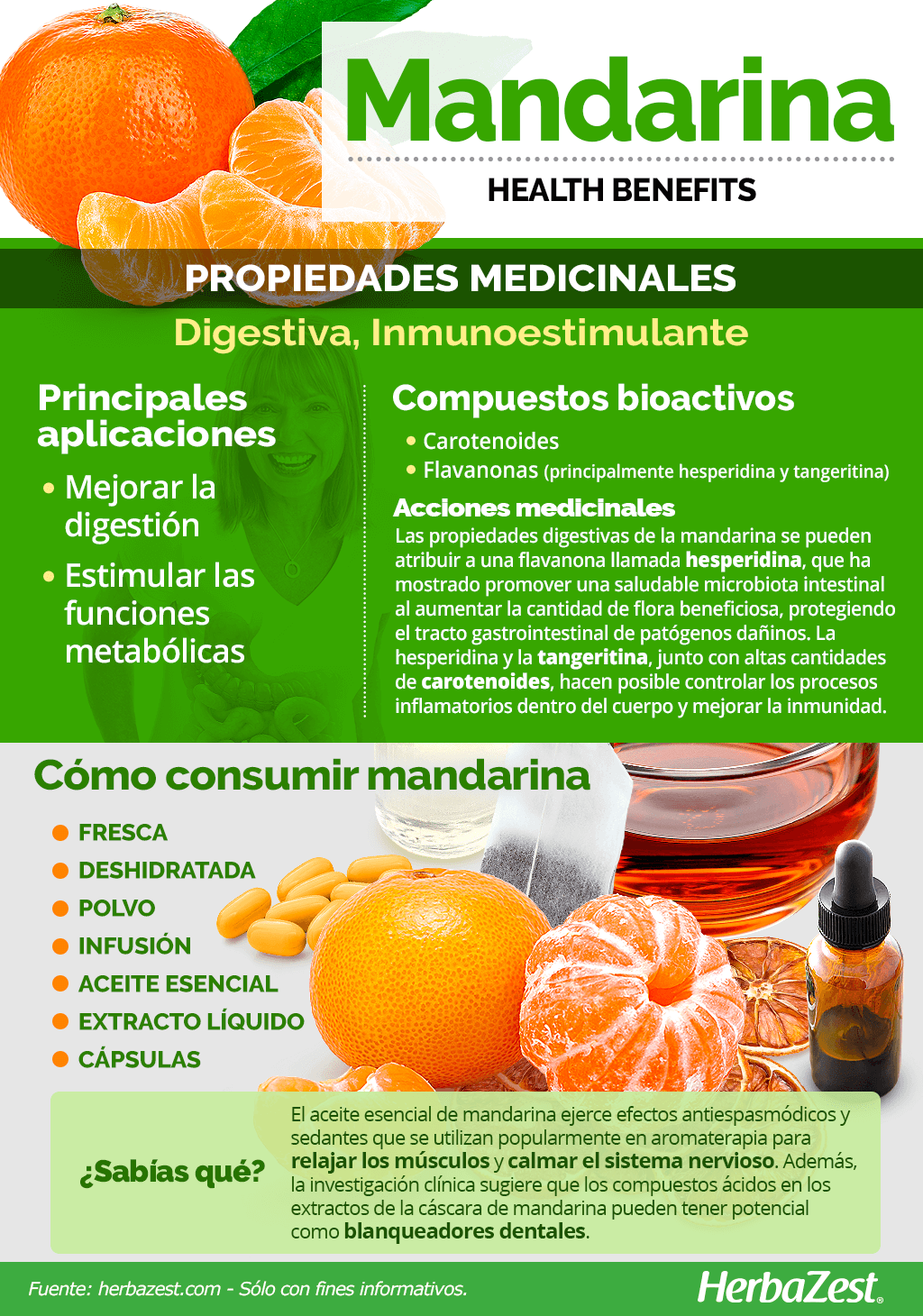 Los beneficios de la mandarina están relacionados con sus altos niveles de compuestos antioxidantes, principalmente carotenoides y flavanonas (hesperidina, naringina, tangeritina y rutina) con fuertes propiedades bioactivas.