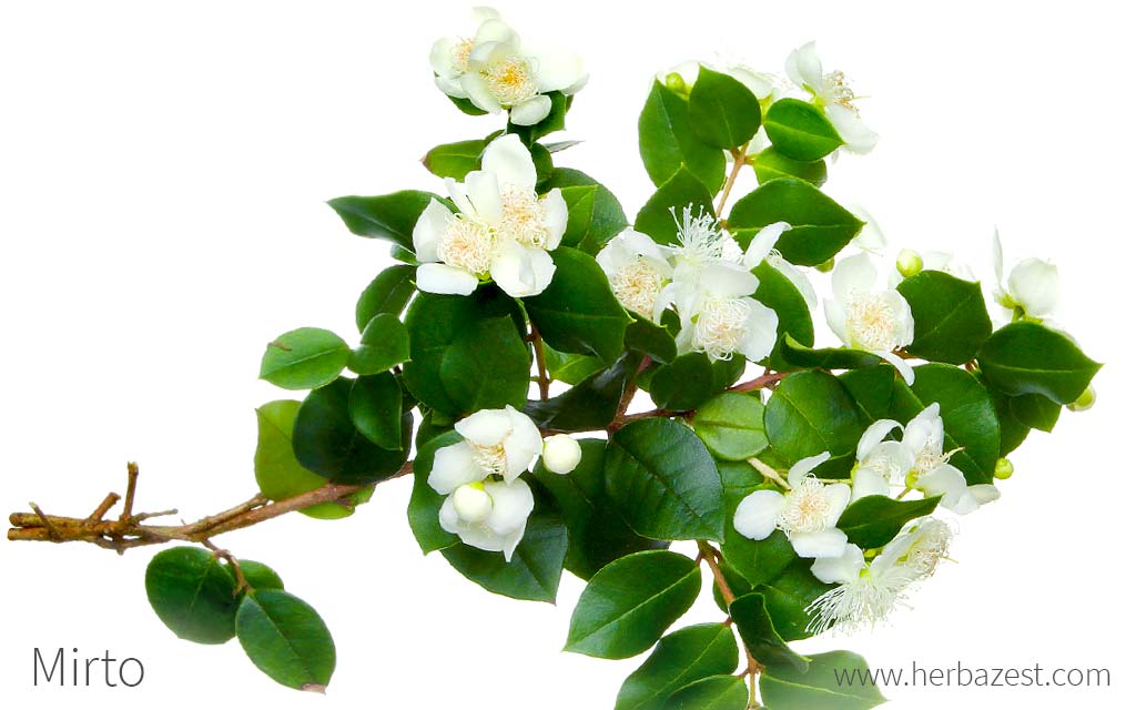 El mirto (Myrtus communis) es un miembro de la familia Myrtaceae, que comprende aproximadamente 155 géneros y 3000 especies de árboles y arbustos leñosos en su mayoría aromáticos, como la pimienta de Jamaica (Pimenta dioica), el camu camu (Myrciaria dubia), la guayaba (Psidium guajava) y el clavo de olor (Syzygium aromaticum).