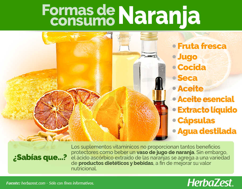 Cápsulas. La naranja dulce es rica en vitamina C (ácido ascórbico), que es aíslada para ser consumida como un suplemento, en dosis diarias estandarizadas, a fin de aprovechar a sus propiedades antiinflamatorias, antioxidantes y de refuerzo inmunológico.