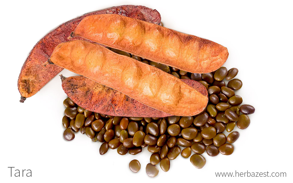 Goma. La goma de tara se obtiene del interior de las semillas (endosperma), y se utiliza a menudo como espesante en recetas culinarias, como repostería y postres; es reducida en nutrientes pero aporta algunos compuestos antioxidantes.