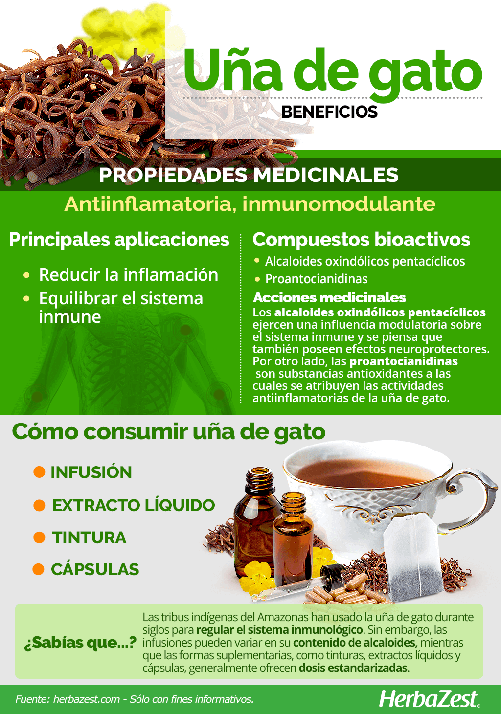 Equilibrar el sistema inmune. Debido a las sustancias bioactivas en su corteza, la uña de gato puede fortalecer la inmunidad ante infecciones por neumococo, mejorando el funcionamiento del sistema inmune y protegiendo al organismo contra otros patógenos dañinos.2
