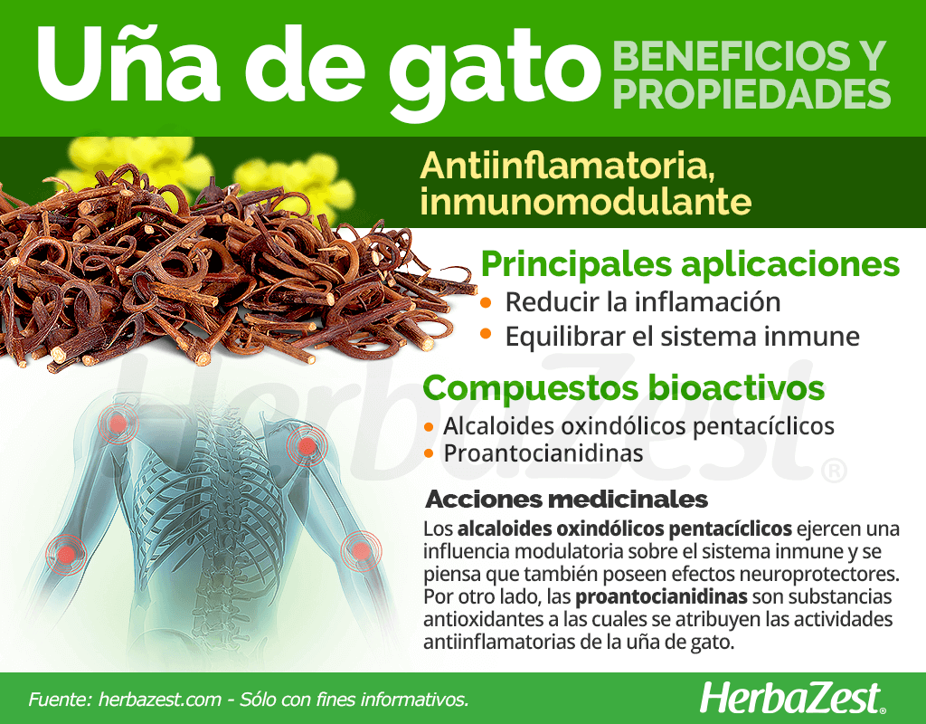 Reducir la inflamación. Tradicionalmente, el principal uso medicinal de la uña de gato ha sido aliviar procesos inflamatorios, en particular aquellos relacionados con dolores articulares. La efectividad de la uña de gato para la artritis en sus diferentes formas ha sido corroborada por estudios científicos.1