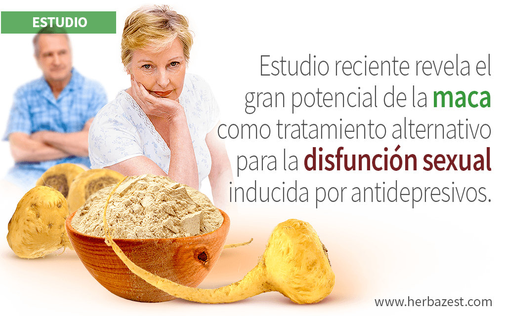 Un grupo de 45 mujeres entre las edades de 18 y 65 años, las cuales sufrían disfunción sexual inducida por antidepresivos durante al menos cuatro semanas, tomó 3,0 g de raíz de maca o placebo diariamente durante 12 semanas. Entre otros requerimientos, las mujeres debían estar en remisión de cualquier trastorno depresivo o de ansiedad, y haber tenido algún tipo de actividad sexual regular antes de iniciar el uso de antidepresivos, así como durante el estudio.