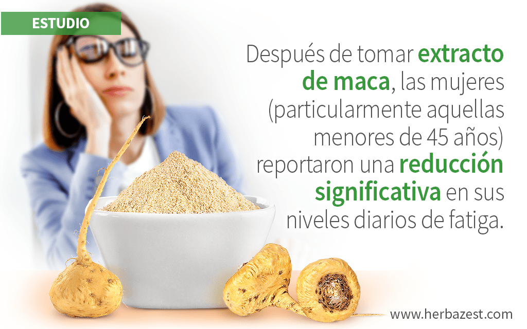 Después de cuatro semanas de tomar el suplemento con maca, las puntuaciones de fatiga disminuyeron en ambos grupos. Sin embargo, las puntuaciones fueron significativamente más bajas en las mujeres menores de 45 años que tomaron maca.