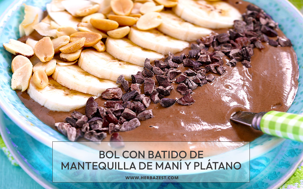 Este bol saludable con batido de mantequilla de maní y plátano es una manera deliciosa y creativa de obtener energía y nutrientes esenciales. Los plátanos, o bananas, son la base de este bol y aportan un dulzor natural, además de favorecer la digestión. La mantequilla de maní aporta cremosidad y sabor, así como grasas saludables, mientras que el cacao convierte este plato en un nutritivo capricho chocolatoso, repleto de compuestos para la salud cerebral. En perfecto equilibrio con la cremosidad de este bol con batido de mantequilla de maní y plátano, esta receta lleva crujientes nibs de cacao, ricos en antioxidantes, y coco rallado tostado, ambos ricos en fibra dietética.