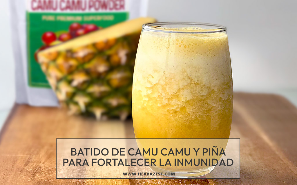 Este poderoso batido de camu camu y piña, naturalmente dulce, refuerza la inmunidad natural de una manera deliciosa. Tanto el camu camu como la piña comparten su contenido de vitamina C, que tiene efectos antioxidantes en el cuerpo. Por otro lado, el jengibre, la canela, la pimienta negra y la cúrcuma le aportan compuestos antibacterianos y antiinflamatorios que ayudarán a mantener a raya los resfriados estacionales.