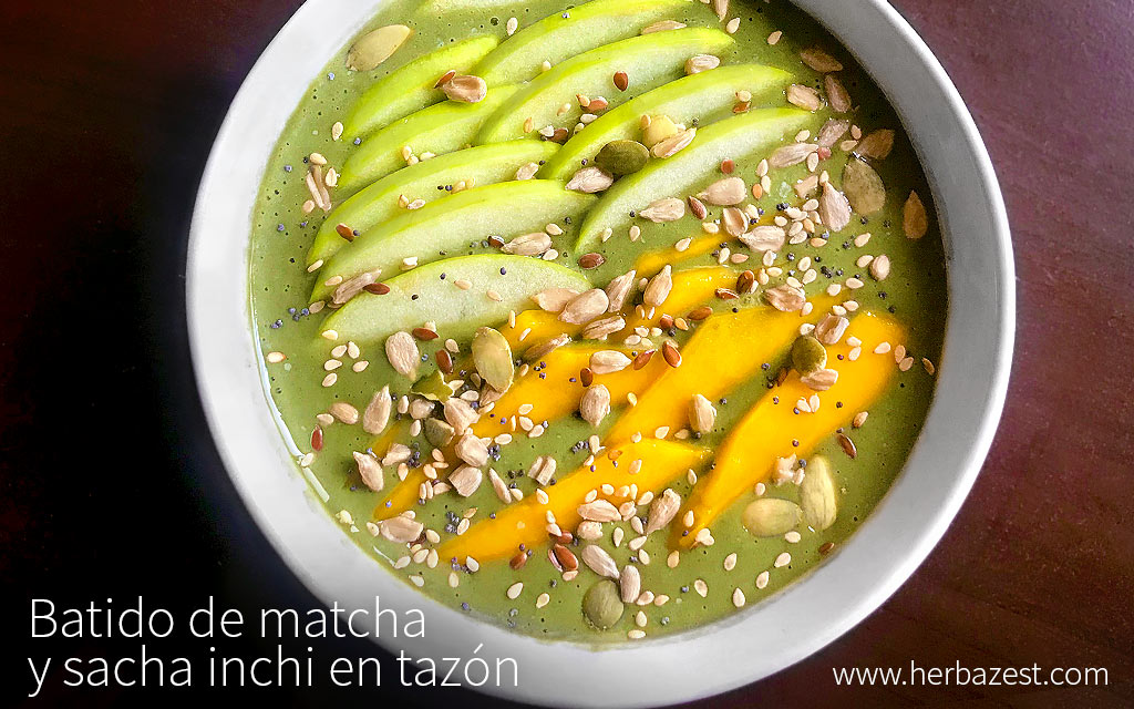 Este batido de matcha y sacha inchi en tazón puede cubrirse con cualquier fruta que tenga a mano, como manzana, mango, o kiwi. Decorar con nueces y semillas, tales como sésamo, girasol o almendras, enriquecerá este poderoso desayuno con fibra dietética y grasas saludables.