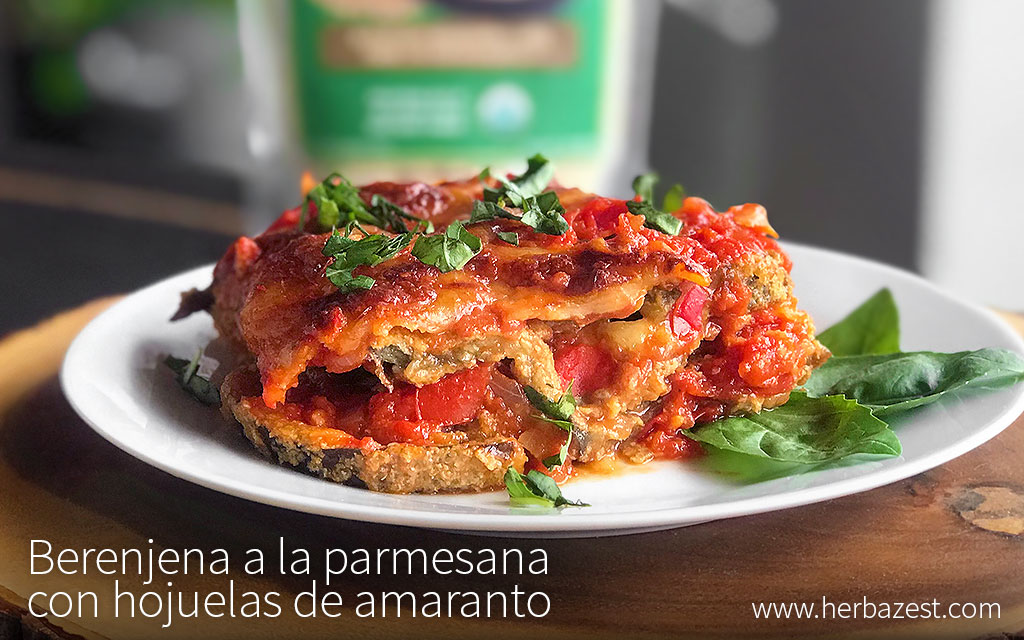 La berenjena a la parmesana es un plato italiano muy popular, conocido por sus deliciosas capas de berenjena empanizada bañadas en salsa marinara y queso mozzarella. Esta receta es una versión más ligera y nutritiva de este plato clásico porque el pan rallado se reemplaza por hojuelas de amaranto, que aportan proteínas completas de origen vegetal, y el queso parmesano se reemplaza por levadura nutricional. Decorada con albahaca fresca, esta receta de berenjena a la parmesana con hojuelas de amaranto puede convertirse en su platillo favorito.