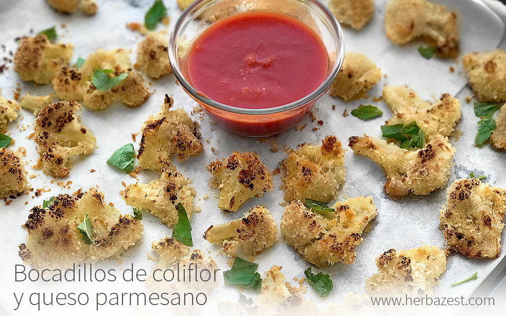 Estos bocaditos de coliflor y queso parmesano pueden comerse solos o acompañados con salsa marinara y albahaca fresca.