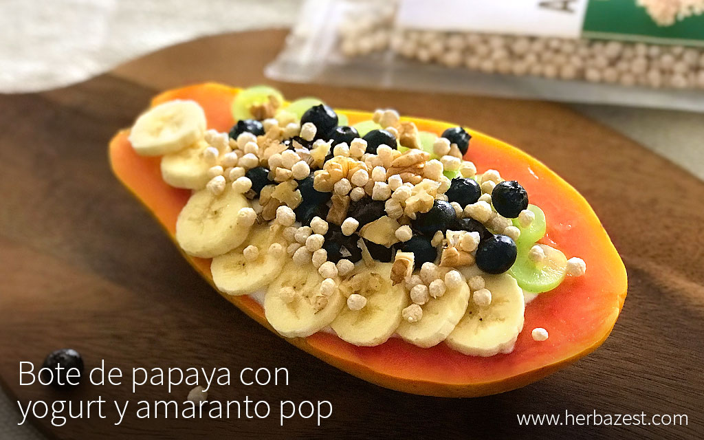 Para recrear los botes de papaya que se presentan en esta receta, es necesario añadir 2 cucharaditas de jarabe de arce (mezclado con el yogurt), 1 plátano (en rodajas), ½ taza de arándano azul, ¼ de taza de uva (en rodajas), 2 cucharadas de trocitos de nuez de Castilla y ¼ de taza de amaranto pop.
