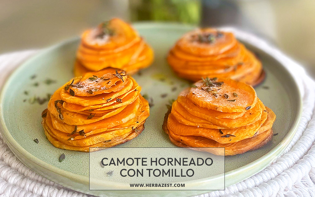 En esta receta festiva consiste en capas de finas rodajas de camote horneadas con tomillo y mantequilla, con bordes crujientes y un centro tierno. Estas rodajas de camote al horno, sabrosas y aromáticas, son una guarnición fácil y elegante.