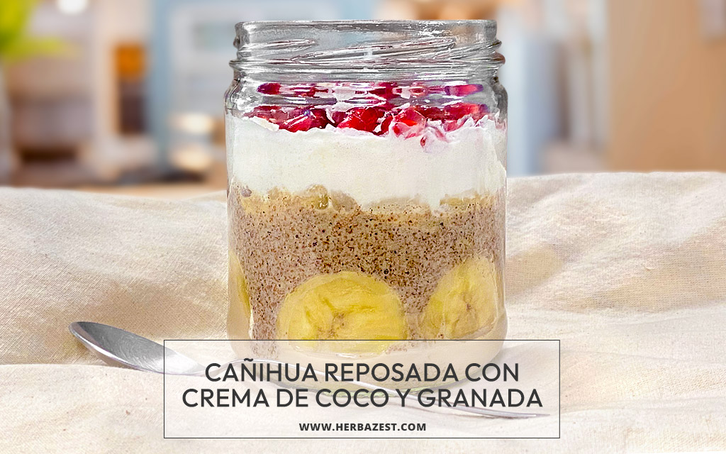 - Cuando esté listo para servir, verificar la textura de las hojuelas de cañihua y agregar un poco más de leche si es necesario. Luego, transferir a un frasco y decorar con rodajas de plátano o banana, crema batida de coco y semillas de granada. ¡Disfrutar!(2 minutos)