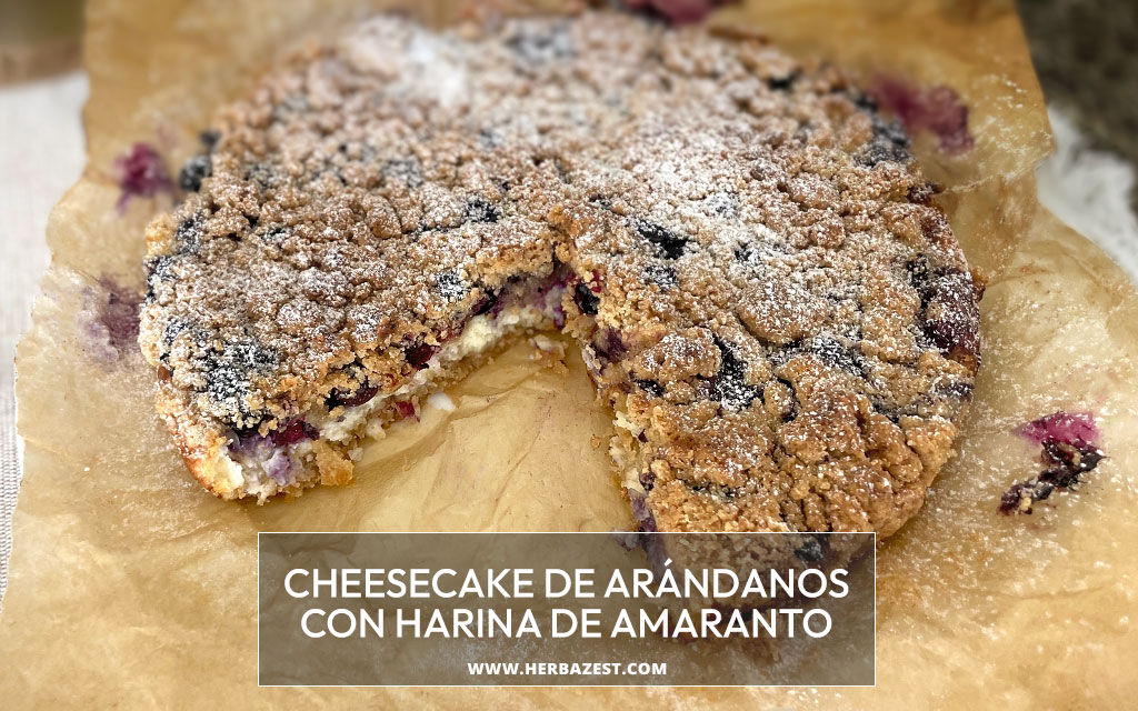 Este cheesecake rústico de arándanos tiene un relleno cremoso, una base y cobertura de crumble mantecoso, y notas a nuez del amaranto. Una preparación sencilla con una textura suave en capas y un contraste delicado.