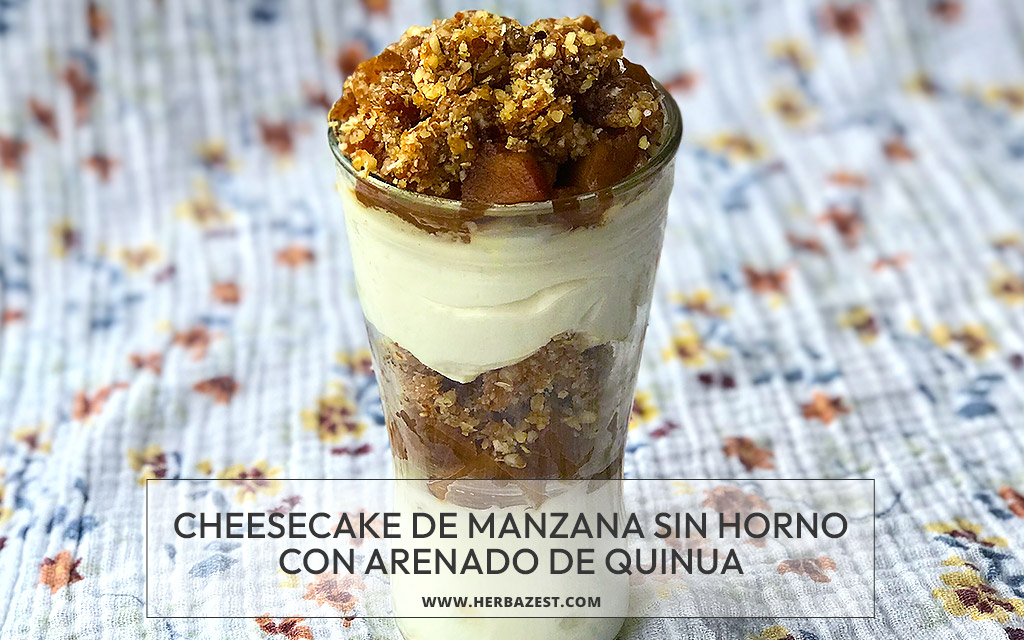Este cheesecake de manzana sin horno se sirve en vasos o frascos y es un regalo perfecto para el otoño. Combina el sabor y el aroma de las manzanas y la canela, dispuestas en capas con una mezcla de queso crema y un crujiente arenado de quinoa en hojuelas, pecanas y dátiles. Delicioso y saludable, es una forma ligera de disfrutar los sabores del otoño.