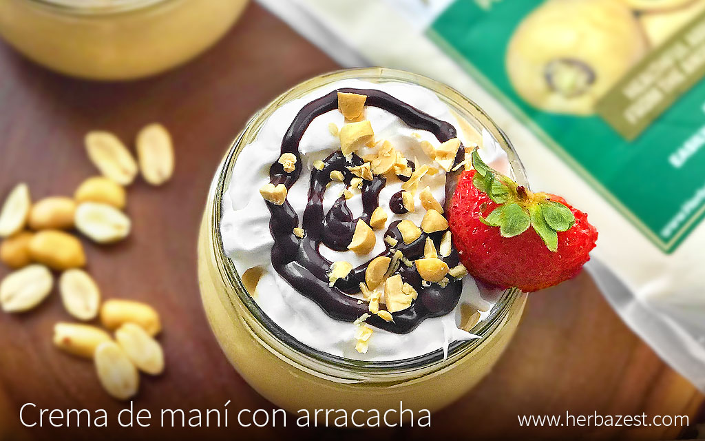 Puede cubrir esta crema de maní con arracacha con leche coco batida a punto chantilly, chocolate derretido y maní triturado.