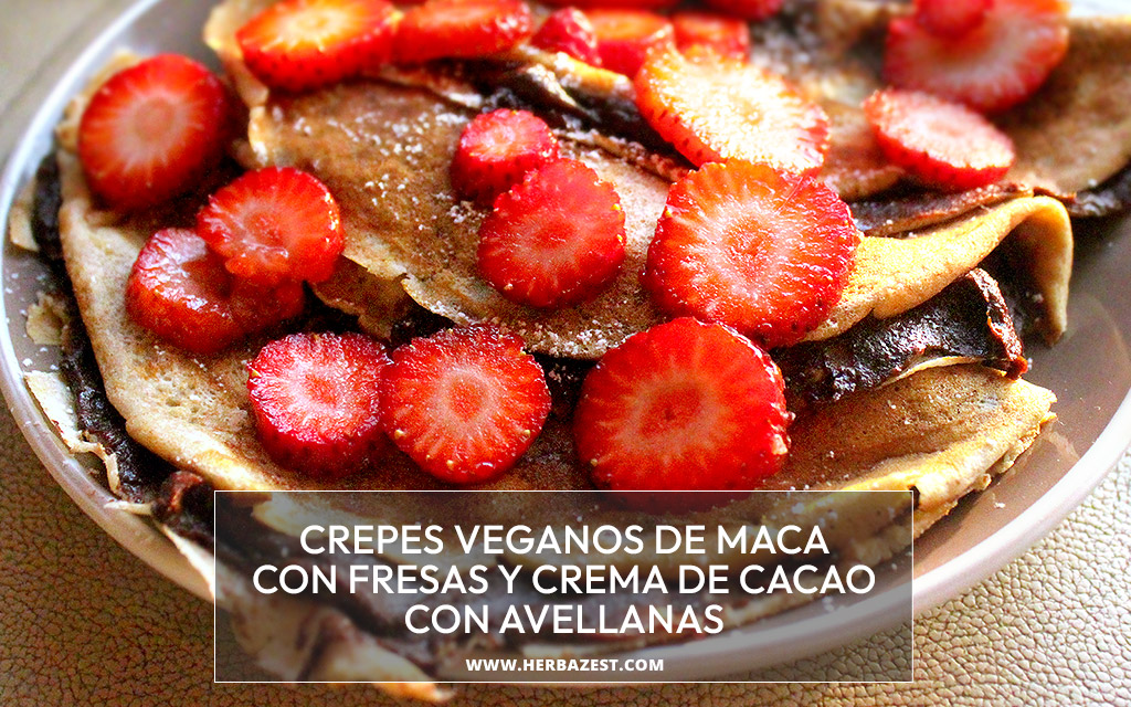 ¡Estos nutritivos crepes veganos de maca con fresas y crema de cacao con avellanas se convertirán rápidamente en los favoritos para el desayuno, el postre y cualquier momento del día! Están hechos con harinas saludables de almendras y coco, así como linaza en polvo. Un ingrediente importante es la raíz de maca, un tubérculo andino que aporta alcaloides famosos por sus efectos estabilizadores sobre el sistema endocrino. Estas crepes veganas de maca con fresa están rellenas de un deliciosa crema de cacao y avellanas, que proporciona dulzura y nutrición, ya que tanto las avellanas como el cacao aportan vitaminas, minerales y compuestos antioxidantes que estimulan la función cerebral.