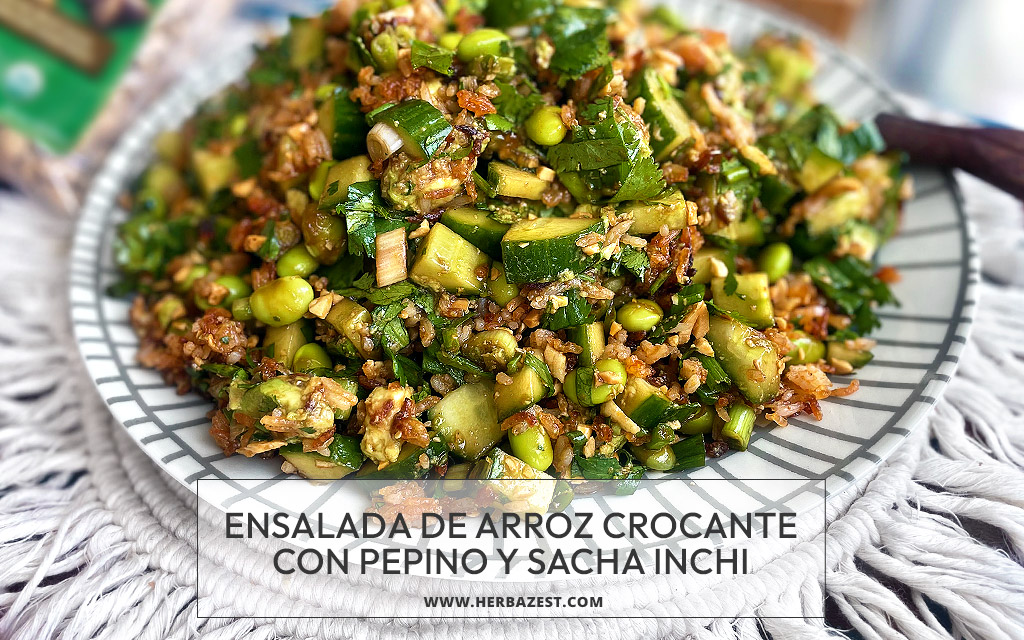 Esta ensalada de arroz crocante es una deliciosa fusión de texturas y sabores. Una combinación de vegetales verdes no solo aporta una textura fresca y crujiente, sino también una gran cantidad de nutrientes y fitoquímicos. Las semillas de sacha inchi, ricas en proteínas y ácidos grasos omega-3, reemplazan al maní tradicional, elevando tanto la nutrición como el sabor. Aderezada con un aliño asiático ligeramente picante, con un toque de ácidez, esta ensalada de arroz crocante con pepino es tan nutritiva como deliciosa.