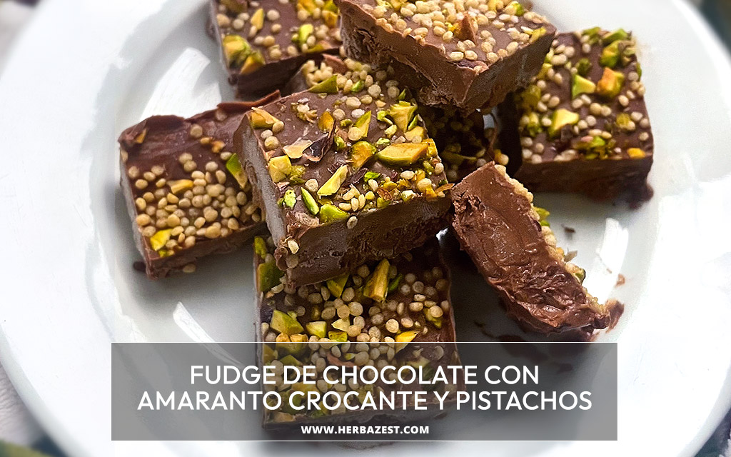 Este fudge de chocolate con cobertura crocante está hecho con pocos ingredientes que logran un resultado delicioso. Su base cremosa, naturalmente rica en proteínas y antioxidantes, está compuesta de yogurt griego y puro cacao, en tanto que su cobertura combina pistachos y amaranto crocante, que aportan aún más nutrientes esenciales. De manera opcional, si se desea suavizar el intenso sabor del cacao, este sencillo fudge de chocolate casero con amaranto y pistachos puede endulzarse naturalmente con jarabe de arce o estevia.