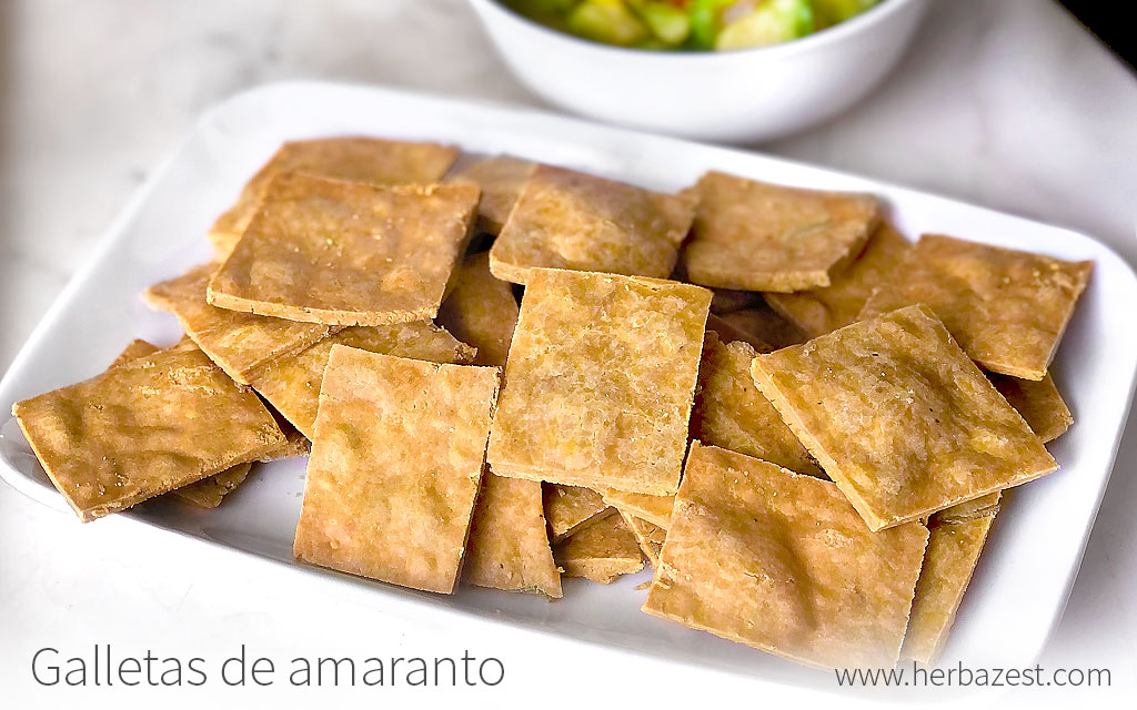 Estas galletas caseras con harina de amaranto pueden disfrutarse solas o acompañadas de una gran variedad de salsas cremosas, como guacamole, crema de frijoles con ajo asado, baba ganoush o hummus de maca, y también son un gran complemento para una ensalada verde.