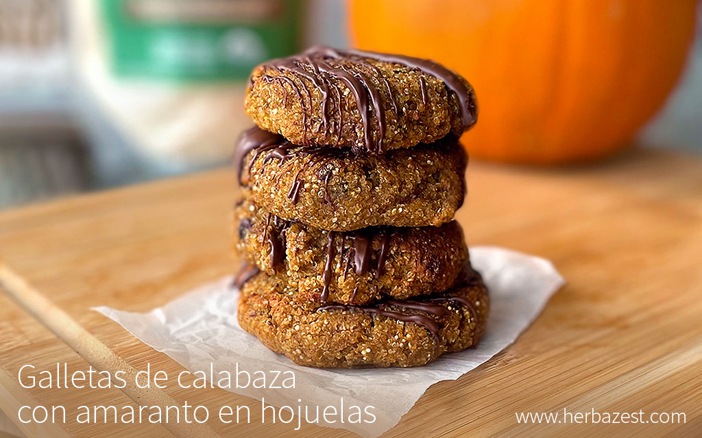 Estas galletas con calabaza y amaranto son un delicioso postre de otoño, ya que combinan una agradable textura con el sabor del puré de calabaza y el chocolate. También tienen entre sus ingredientes hojuelas de amaranto, un superalimento sin gluten rico en proteínas, fibra, hierro, calcio y antioxidantes. Las hojuelas de amaranto le dan a estas galletas un delicado sabor a nuez y una textura crocante.