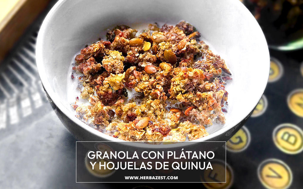 Esta granola con plátano y hojuelas de quinoa hará del desayuno un delicioso manjar, ya que es rica en fibra dietética y carbohidratos complejos, que se liberan lentamente, produciendo una prolongada sensación de saciedad y mejorando la digestión. Además, su contenido de proteína completa, gracias a la quinua, así como las grasas saludables de las nueces y las semillas de calabaza, convierten a esta granola con plátano en una alternativa saludable y balanceada.