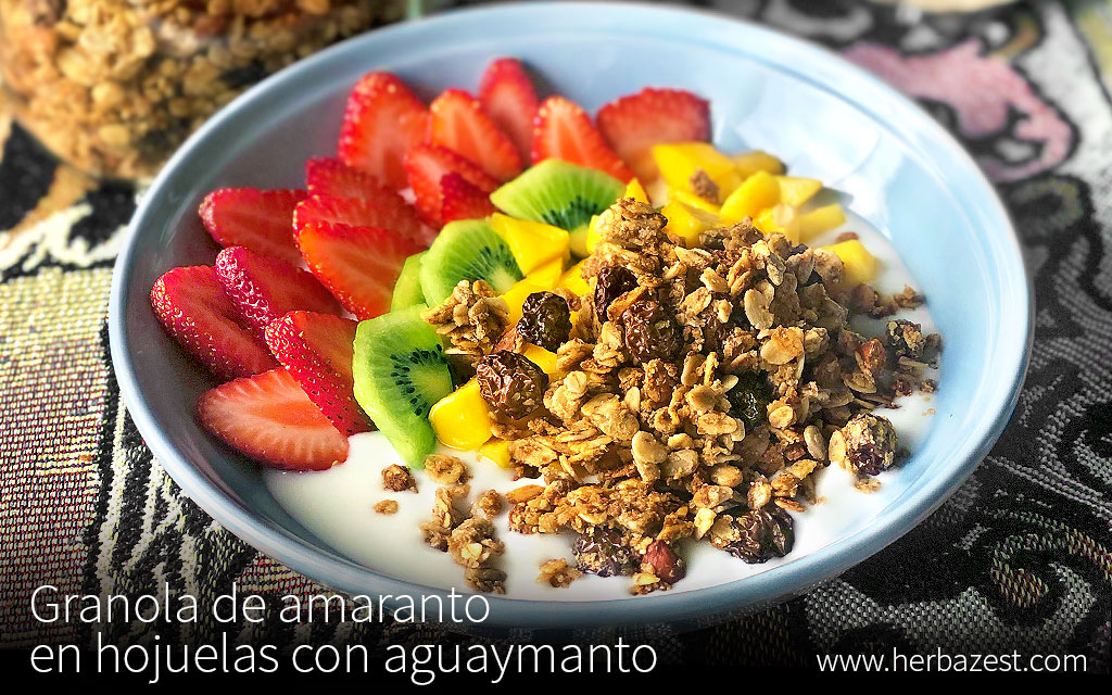 Esta granola casera es rica en fibra y nutritiva. Con su tetura crujiente y su aroma a canela, es un complemento ideal de la leche y al yogur en el desayuno. Además de la avena, que es el ingrediente más común de este tipo de preparaciones, esta granola de amaranto en hojuelas y agauymanto es rica en proteínas y vitaminas, además de ser tan deliciosa que provoca comerla directamente del frasco.