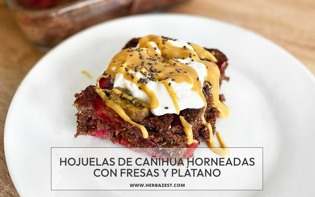 Estas hojuelas de cañihua horneadas con fresas y plátano pueden decorarse con yogurt, mantequilla de maní y semillas de chía para obtener una dosis extra de probióticos y grasas saludables.