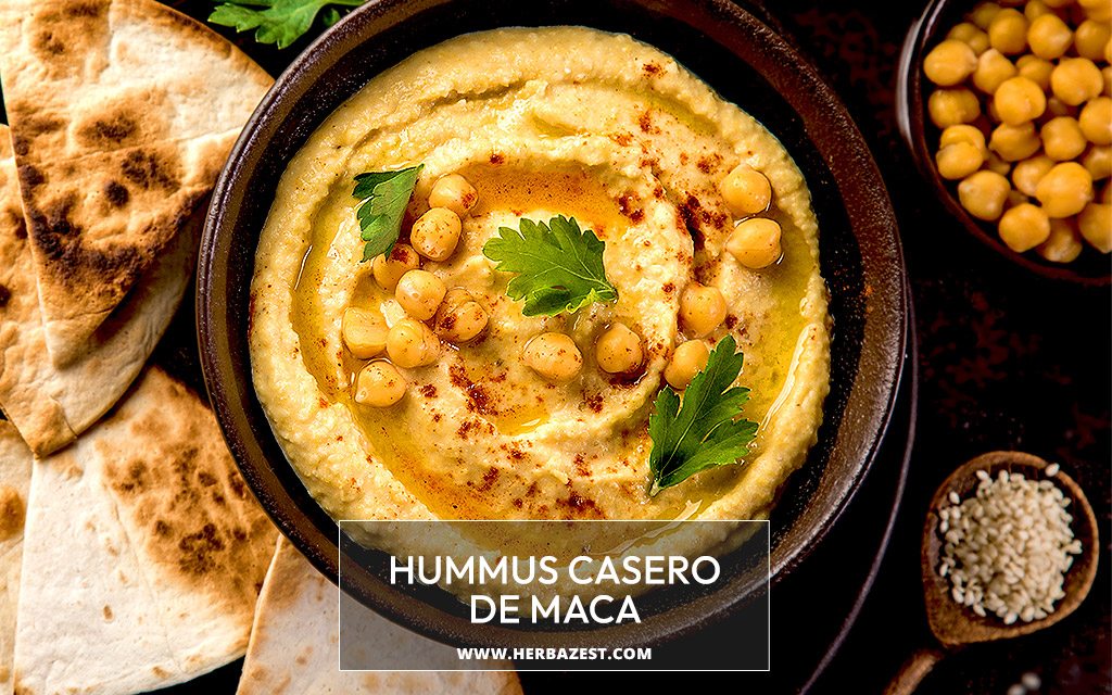 A los amantes del hummus y las recetas saludables les encantará este novedoso giro a un clásico de la cocina árabe. Los garbanzos son una gran fuente de proteínas vegetales, así como de carbohidratos complejos y fibra dietética. Por otro lado, la raíz de maca aporta compuestos capaces de nutrir las glándulas endocrinas para regular la producción de hormonas del organismo, aliviando así los síntomas del desequilibrio hormonal.