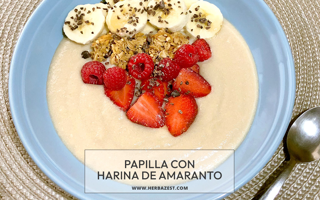La harina de amaranto hace que esta papilla se cocine rápidamente. El amaranto es un cereal sudamericano que ofrece proteínas, fibra dietética y una gran cantidad de vitaminas y minerales, tales como manganeso, cobre o magnesio, para comenzar el día de forma nutritiva.