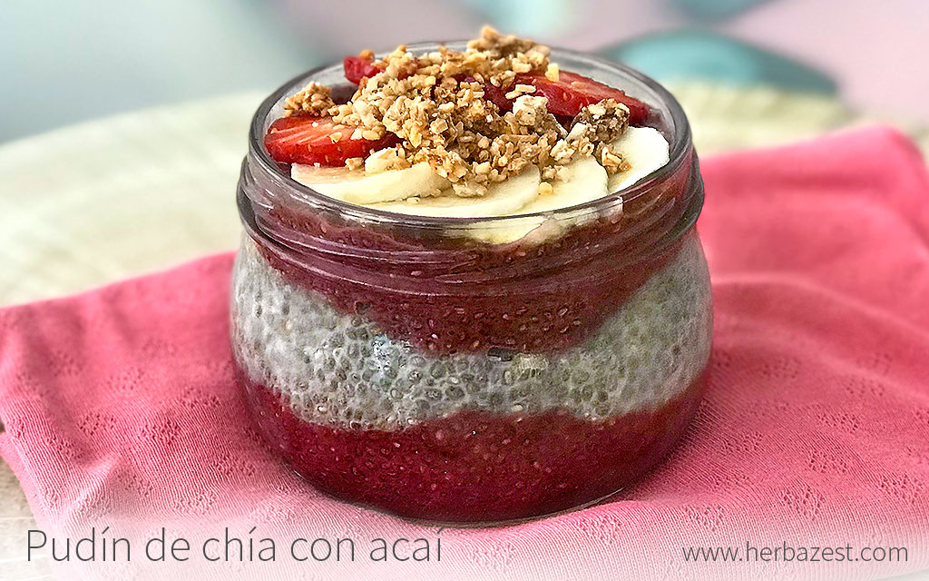 Ligero y nutritivo, este pudín de chía con acaí se puede disfrutar como desayuno, merienda o postre. Las semillas de chía están cargadas de proteínas y fibra, que ayudan a regular los niveles de azúcar en la sangre y estimulan el metabolismo. El acaí, por otro lado, es rico en antioxidantes y vitamina A, lo que lo ayuda a mantener un óptimo estado de salud.