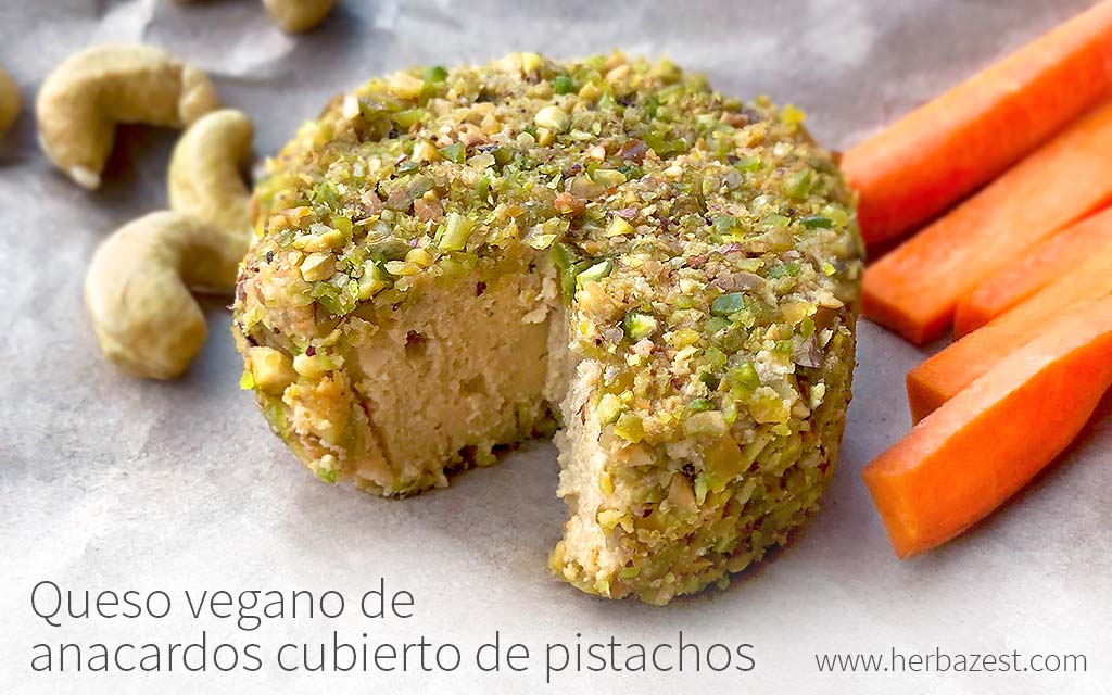 Sin duda, este queso crema de anacardos, recubierto de pistachos, superará las expectativas más altas. Los anacardos son frutos secos versátiles que se pueden utilizar tanto en postres saludables como en platos salados. Son una buena fuente de proteínas de origen vegetal, así como de grasas saludables que ayudan a reducir el colesterol "malo", protegiendo al corazón. Su sabor ligeramente dulce y su consistencia suave los convierten en una excelente base para quesos veganos, especialmente cuando se sazonan con levadura nutricional y pasta de miso. Cubierto de una costra de pistachos, ricos en fibra y potasio, este queso vegano de anacardos es tan delicioso como saludable.