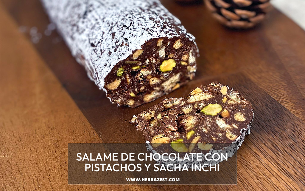 De origen italiano y portugués, el salame de chocolate es un postre fácil y divertido de hacer. Tiene el típico aspecto del salame tradicional, pero se trata de un delicioso poste hecho con chocolate amargo e ingredientes crujientes. El cacao aporta su rico contenido de antioxidantes y minerales, mientras que las semillas de sacha inchi y los pistachos añaden grasas saludables y proteína vegetal.