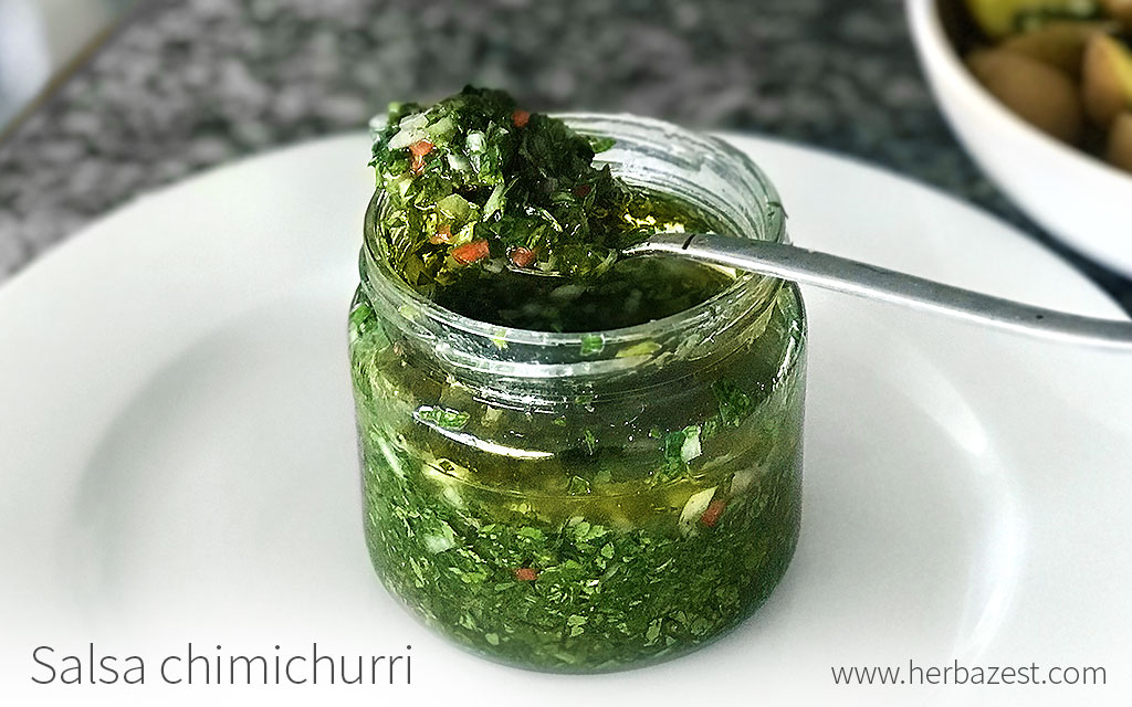 El chimichurri es una aromática salsa sudamericana, llena de sabores intensos y un poco picante. Elaborado con un hierbas frescas, no solo puede realzar diversos platos, sino también enriquecerlos con importantes vitaminas y minerales.