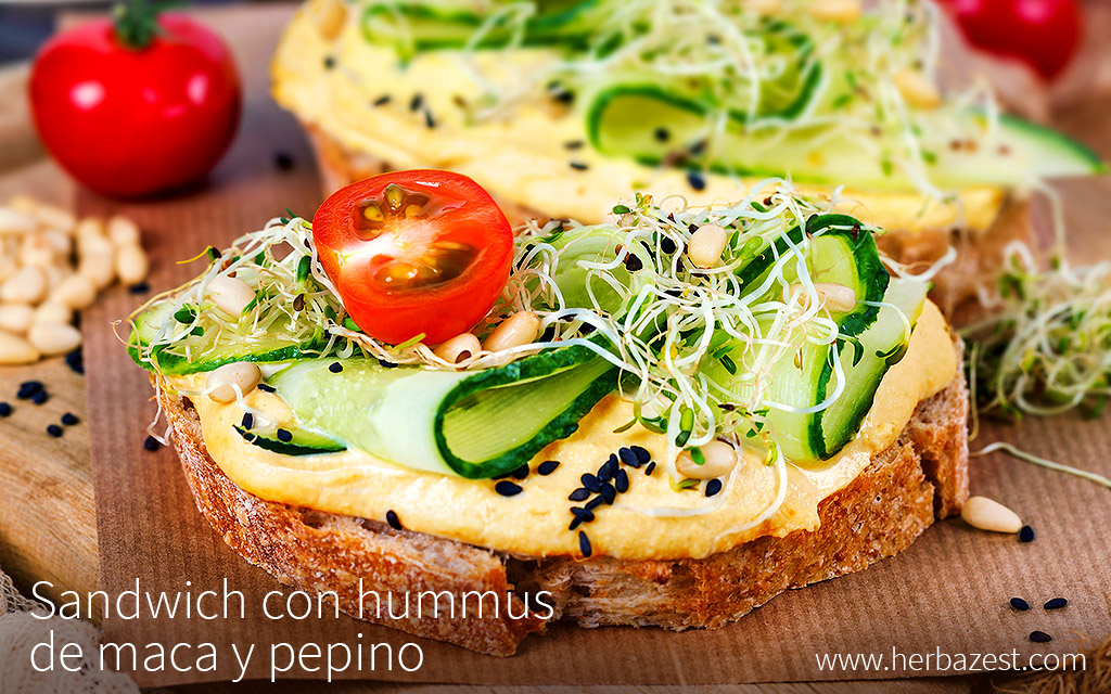 Ya sea que tenga a mano, o no, hummus de maca casero, este sándwich se puede preparar en muy poco tiempo. Es rico en proteínas saludables y fibra dietética, lo que lo convierte en una excelente comida para combatir la indigestión y mejorar la función intestinal. Las verduras frescas le aportan una textura crujiente y muchas vitaminas. Los brotes de alfalfa pueden ayudar a disminuir la absorción de grasas y ayudar a equilibrar los niveles de colesterol. Los pepinos, por otro lado, son conocidos por sus sustancias antiinflamatorias y antioxidantes, que pueden reducir los signos del proceso de envejecimiento. Las semillas de sésamo y los piñones proporcionan grasas saludables y antioxidantes a este sándwich vegano con hummus.